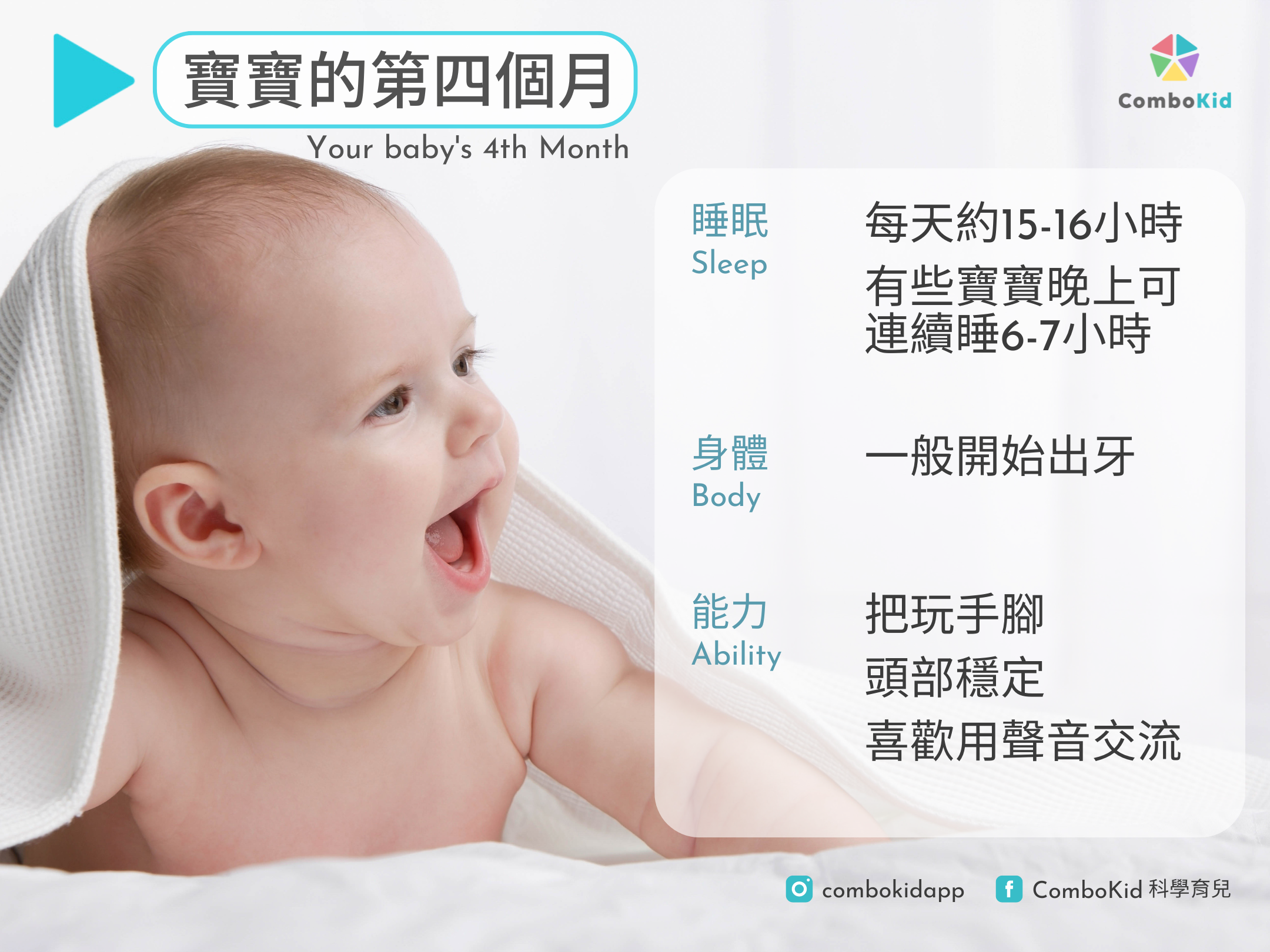 踏入第四個月,您和寶寶都已適應了日常的生活模式和規律。現時,寶寶會開始展現出個人特質與個性,並對周圍的世界表現好奇及興趣。作為爸爸媽媽的您定必會發現,您的寶寶越來越逗人喜愛呢!